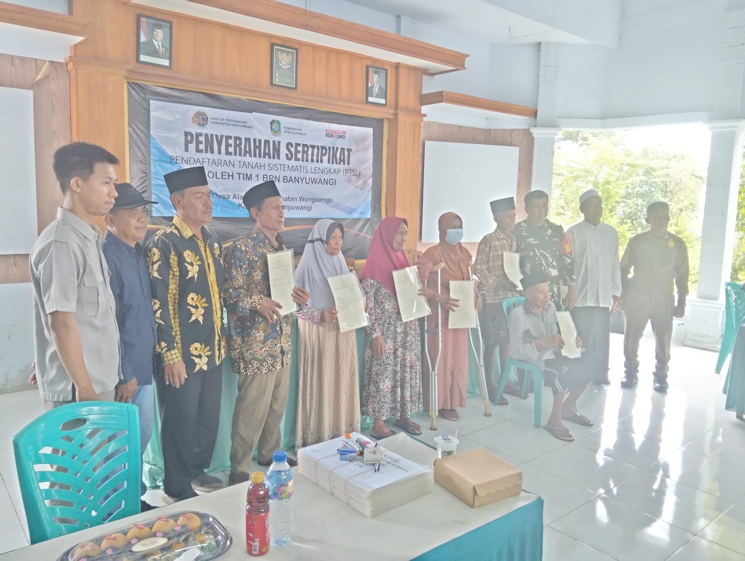 Acara serah-terima yang digelar di Lapangan Desa Alasrejo dihadiri oleh perwakilan BPN Kabupaten Banyuwangi, Camat Wongsorejo, Kades Alasrejo, serta perwakilan warga penerima sertifikat.