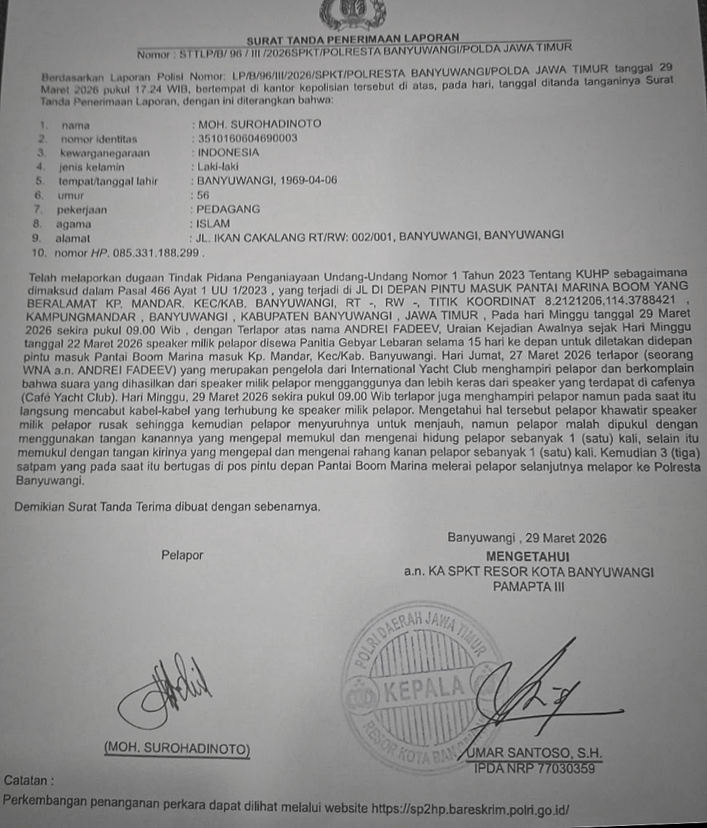BANYUWANGI | golal.i-news.site – Puncak tradisi lebaran, masyarakat Bumi Blambangan, sejak ratusan tahun meramaikan pelabuhan Boom, akrab di juluki taman hiburan rakyat (THR), kini akrab disapa pelabuhan Marina, Minggu (29/3/2026) diributkan seorang warga negara asing (WNA) asal Rusia berinisial AF diduga menganiaya pemilik sound system, Suro Hadi (56), di Pantai Marina Boom Banyuwangi.