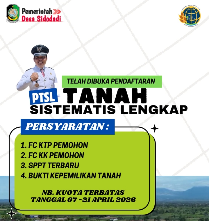 BANYUWANGI | global.i -news.site – Pemerintah Desa Sido Dadi, Kecamatan Wongsorejo, Kabupaten Banyuwangi, mengumumkan pembukaan pendaftaran program Pendaftaran Tanah Sistematis Lengkap (PTSL). Program ini akan berlangsung selama dua minggu, mulai dari tanggal 7 April hingga 21 April 2026, dengan target kuota penerima mencapai 300 hingga 500 peserta.